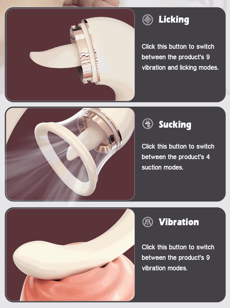 Combines tongue – licking, sucking, and in – body vibration functions. The 9 vibration and 9 thrusting modes bring rich and intense pleasure, whether it’s a gentle caress or a strong impact. - Distinctive Appearance